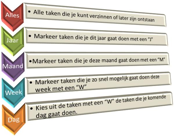Kies nu een beperkt aantal taken uit de lijst die je deze week (“W”) echt kan doen.